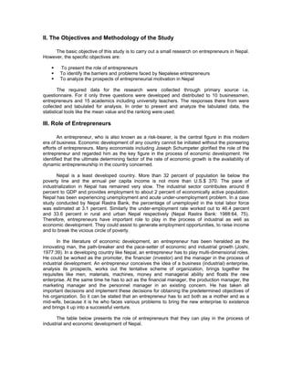 This document summarizes an empirical study on entrepreneurs in Nepal. It defines entrepreneurs and their roles in economic development. Entrepreneurs in Nepal face many barriers including limited access to capital, low confidence, and unstable policies. To motivate more entrepreneurship, the study recommends increasing access to finance, creating a supportive environment, and expanding training opportunities. Overall, the document analyzes the importance of entrepreneurs for Nepal's economy and identifies ways to encourage their activities.
