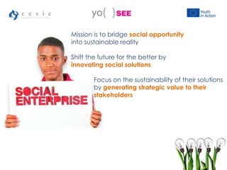 This document outlines the key elements of a social enterprise plan, including identifying a problem or challenge, developing a vision and mission, creating a theory of change, proposing an innovative solution, measuring social impact, assembling a competent team, and establishing a sustainable financial model. The social enterprise plan framework includes 7 conceptual elements: challenge/opportunity, vision, mission, theory of change, solution/idea, social impact, team, and financial summary. The purpose is to provide a structured approach to developing and communicating a social enterprise concept that bridges social problems with viable business solutions.