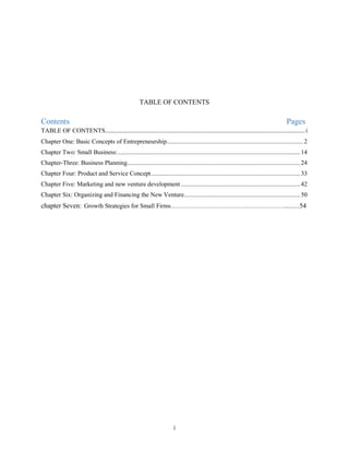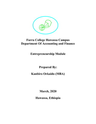This document is an entrepreneurship module prepared by Kanbiro Orkaido for Furra College Hawassa Campus. It contains 7 chapters that discuss basic concepts of entrepreneurship including definitions, the entrepreneurial process, traits of successful entrepreneurs, and classifications of entrepreneurs. The module provides a comprehensive overview of key topics related to entrepreneurship.