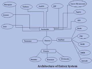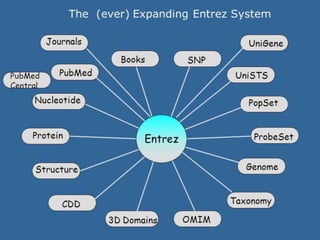 Entrez is a search engine developed by the National Center for Biotechnology Information (NCB) that allows users to search and retrieve data from over 20 integrated biological databases, including sequences, gene records, citations, and abstracts. It provides a single interface to access all linked information on genes and proteins. Users can perform text searches using Boolean operators and view results in various formats like FASTA and XML.