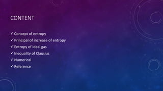 2) It explains the principal of increasing entropy, which states that the entropy of an isolated system never decreases, and increases for irreversible processes.