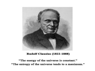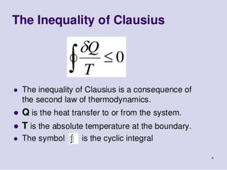 The document discusses entropy, which is a thermodynamic property that serves as a tool for analyzing engineering devices according to the second law of thermodynamics. Entropy can be viewed as a measure of disorder in a system, with more disorganized systems having higher entropy. The Clausius inequality and definition of entropy using heat transfer and temperature are provided. The principles of entropy change for open and closed systems, as well as the increase of entropy principle and third law of thermodynamics, are summarized.