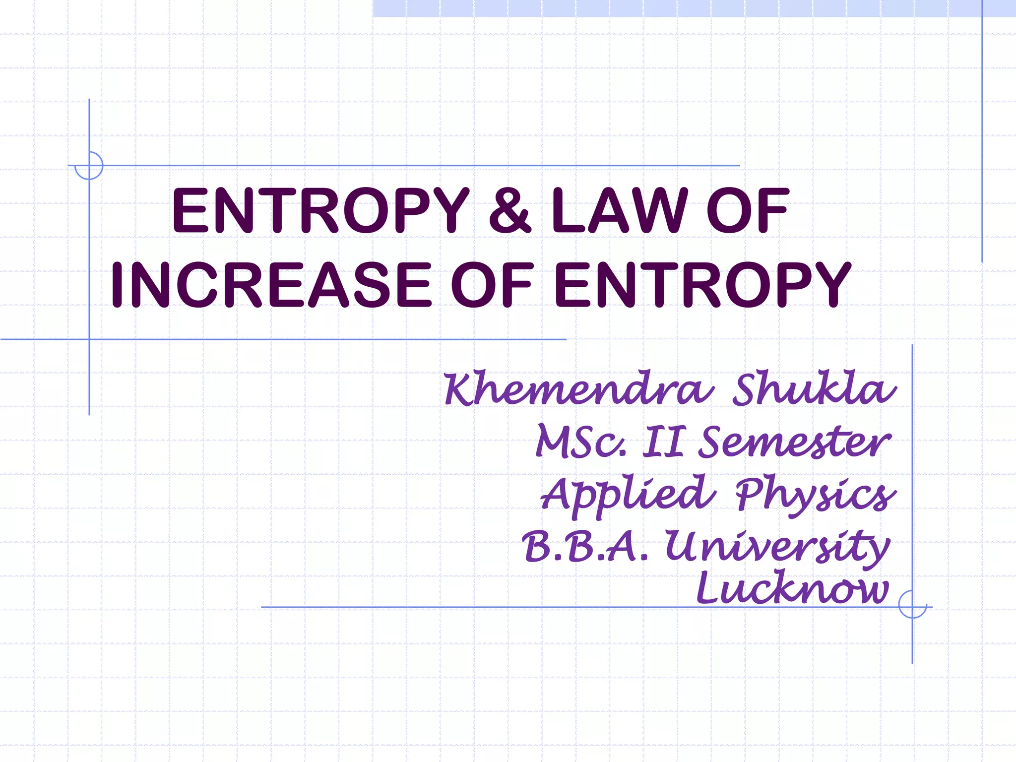 The document discusses entropy from statistical and thermodynamic perspectives. It defines entropy statistically as the natural logarithm of the number of microscopic configurations of a system. The document outlines how entropy is a state function that always increases for irreversible processes according to the second law of thermodynamics. It also discusses how entropy is additive for combined systems and how the conditions of thermal, mechanical, and chemical equilibrium can be defined in terms of entropy being maximized. The Gibbs paradox regarding mixing of ideal gases is also summarized.