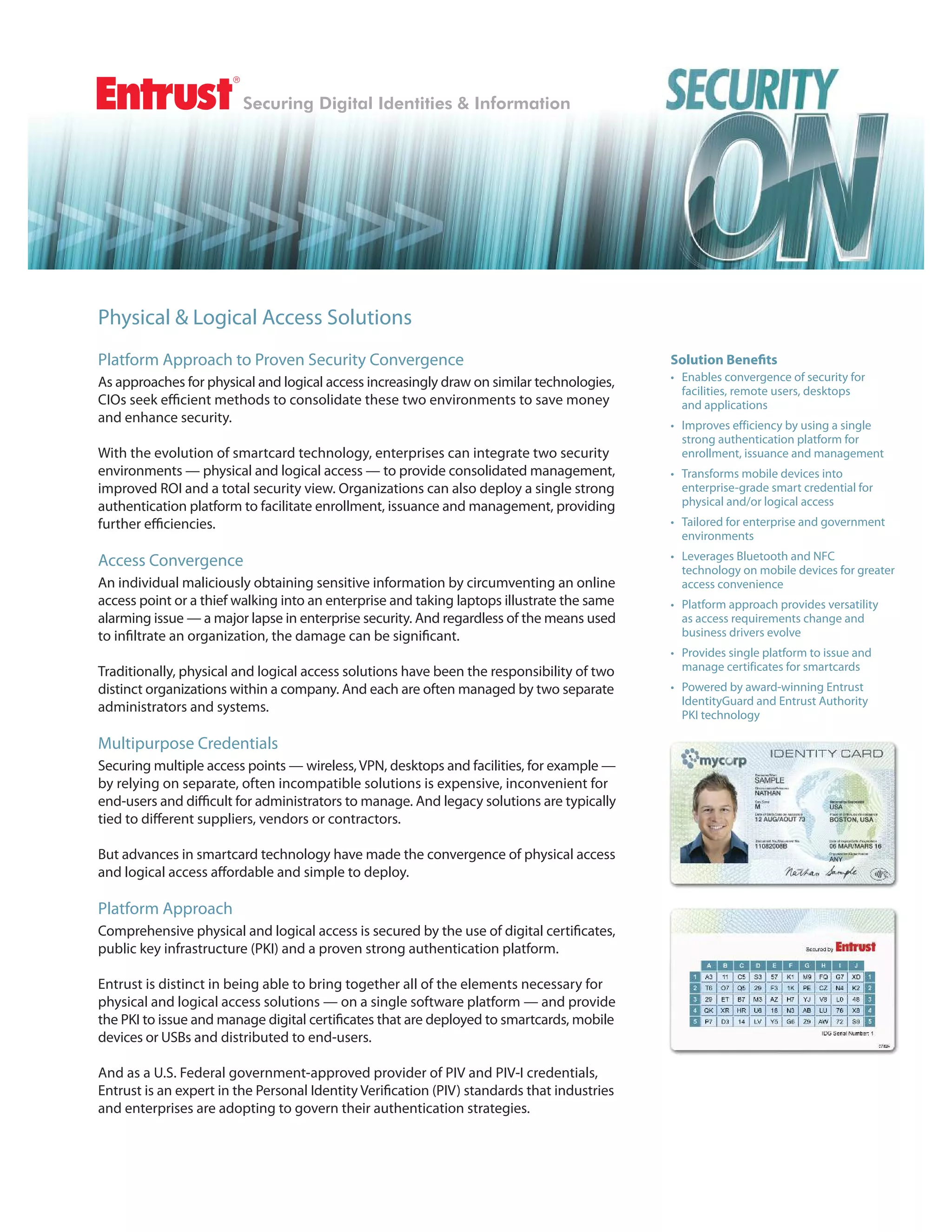 The document discusses a platform approach to integrating physical and logical access security through advanced smartcard technology, enhancing efficiency and cost-effectiveness for organizations. It highlights the benefits of a single strong authentication platform powered by Entrust's technology, which facilitates the management of digital certificates across various access points. Overall, it emphasizes the importance of converging security solutions to improve both user experience and administrative management.