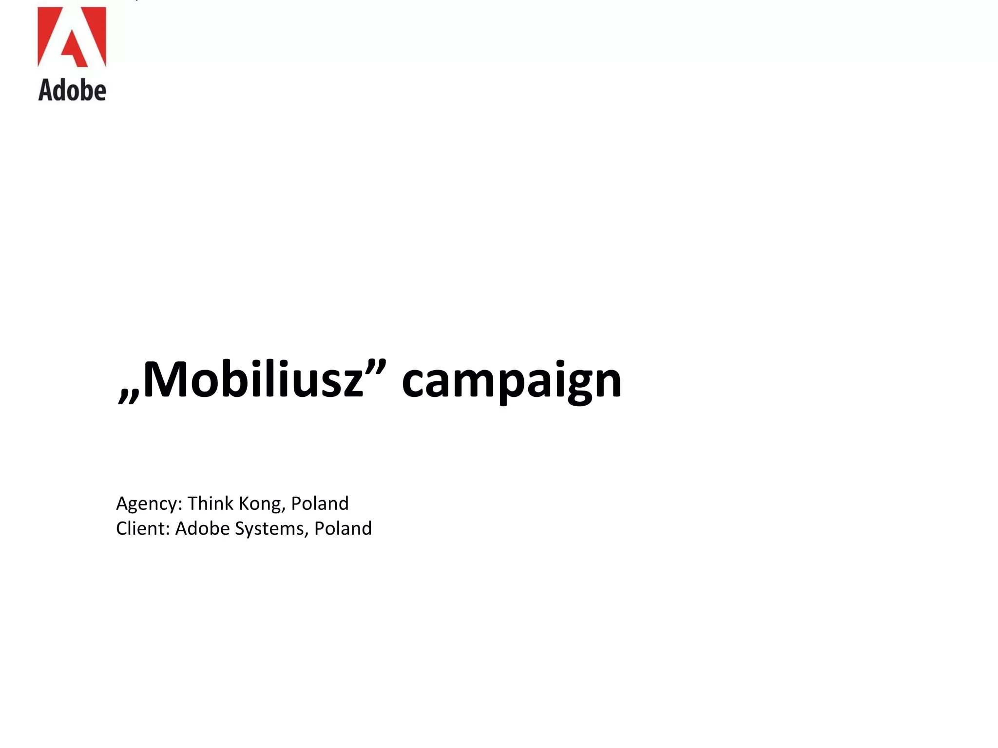 The document summarizes a marketing campaign by Adobe Systems in Poland to promote their Creative Suite 5.5 software suite and its new features for mobile app and website development. The campaign's goal was to reach mobile app developers and show them CS 5.5's abilities. It created an 8-bit game and mobile versions using Adobe products. Experts created video lessons on the site mobiliusz.pl about developing for mobile using CS 5.5. Over 21,000 specialists visited and 2,131 registered for the lessons during the two month campaign period.