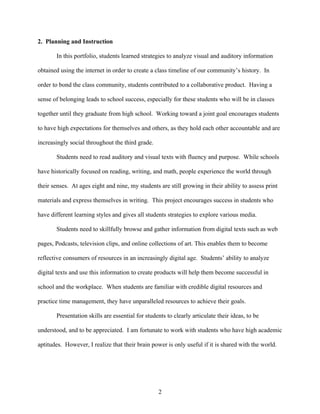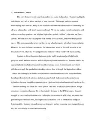 This document provides context about an instructional activity with 21 third grade students in a gifted program. The goal was for students to create a class timeline of their community's history by analyzing visual and auditory information from online sources. Students contributed individually but to a shared collaborative product using software like xTimeline and VoiceThread. The teacher provided guidance and accommodated different learning styles. Student skills like analyzing digital texts, gathering online information, and presenting ideas improved, but relying on authoritative sources remains a work in progress.