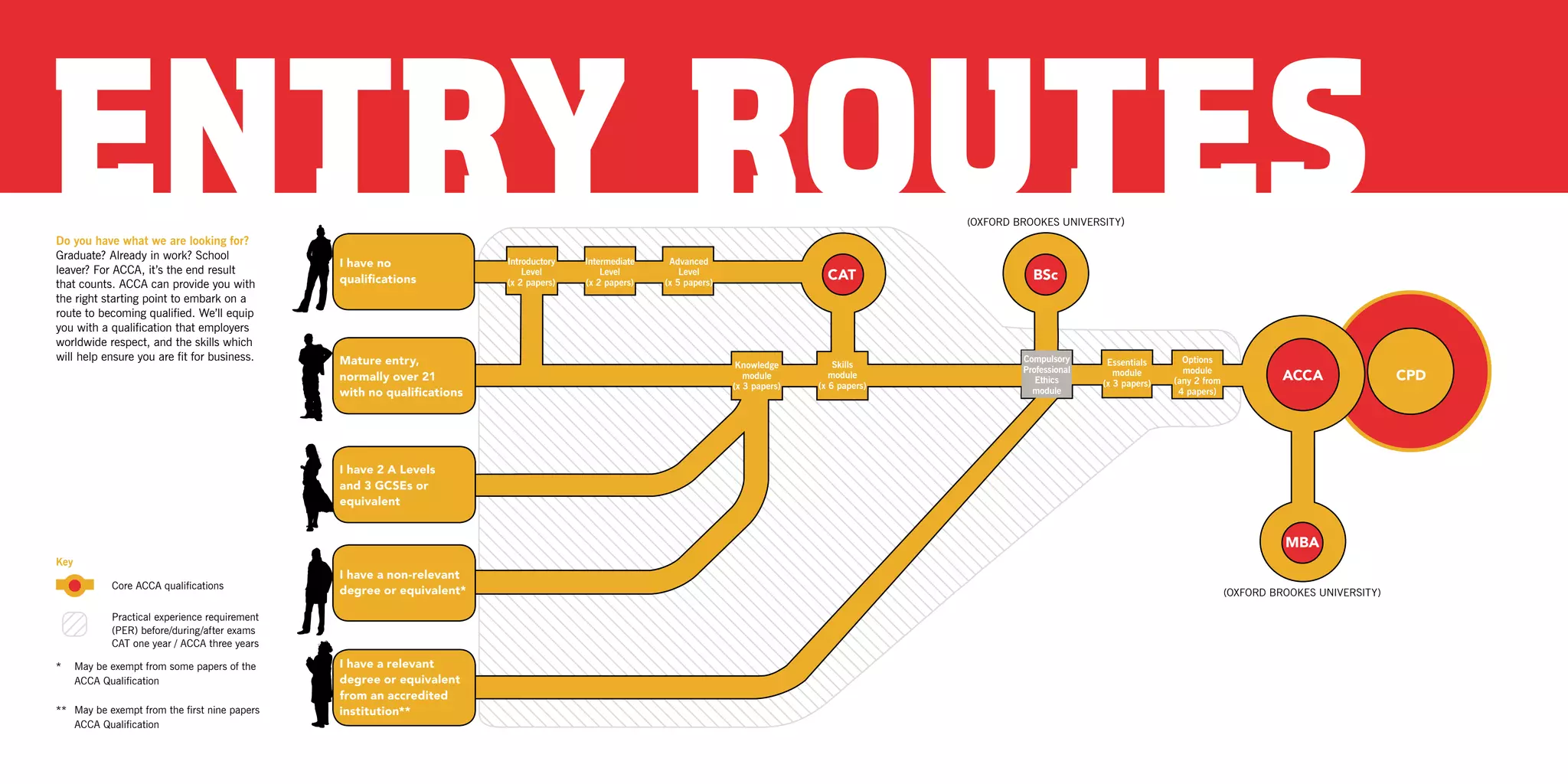 This document outlines the different entry routes and qualification levels for the ACCA accounting program. It shows that ACCA can provide a starting point for graduates, career changers, or school leavers to embark on becoming qualified accountants. The qualification is recognized by employers worldwide and will help students develop skills needed for business. It details the introductory, intermediate, and advanced exam levels students can progress through, as well as experience requirements to earn the full ACCA certification.