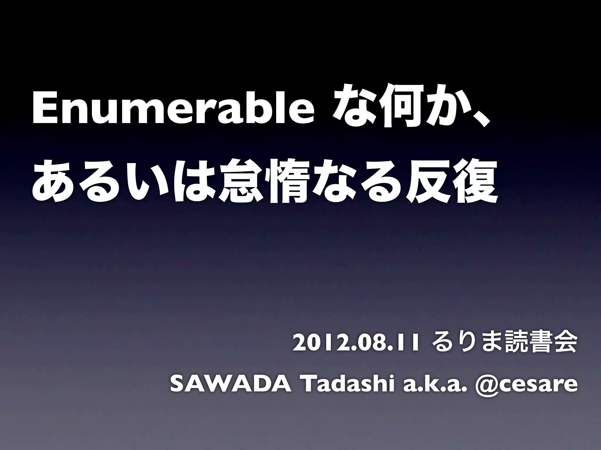 52. 53. 54. 55. 56. 57. 58. 59. 60. 61. 62. 63. 64. 65. 66. 67. 68. 69. 70. 71. 72. 73. 74. Editor's Notes #2 \n #3 \n #4 \n #5 \n #6 \n #7 \n #8 \n #9 \n #10 \n #11 \n #12 \n #13 \n #14 \n #15 \n #16 \n #17 \n #18 \n #19 いろんなやり方があるはず。\nここでは一例を。\n #20 ロードされているクラスのリストがほしい。\nクラスは定数でもあるから、そこから探してみる。\n\n #21 クラス名から、クラスの実体を取り出す方法\n #22 インスタンスが、あるクラス/モジュールに属しているかどうかを調べる\n #23 あるクラスの継承ツリーを調べる。\n先頭の要素が、該当クラス自身である点に注目。\n #24 \n #25 ここでターミナルに切り替えてデモ。\n #26 \n #27 \n #28 →ターミナルでデモ \nUser = Struct.new(:id, :name, :email)\nとかで例を見せる\n #29 ターミナルでデモ\nFile, Dir で例を見せる\n #30 Enumerable なクラスの特徴\nコレクションとは限らない\n #31 \n #32 \n #33 \n #34 each にブロックを渡さないところに注目\n(次以降に例が続く。まだターミナルに切り替えない)\n #35 \n #36 \n #37 \n #38 \n #39 巻戻しもできる\nここでターミナルに切替えてデモ\n #40 \n #41 Enumerator に対して #map を呼出す\nターミナルに切替えてデモ\n #42 \n #43 \n #44 \n #45 Array と Hash じゃ足りないこと、あるよね?\nツリー作るとか。\n #46 手間がかかりそうな予感。\nでも、やってみたら意外とシンプル。\n #47 Enumerable には #each は存在しない。\n(よく考えてみると当然。内部のデータ構造を知らないと each は書けない)\n #48 \n #49 場合によっては泥臭い処理を書かなきゃいけないかも。\n #50 \n #51 \n #52 コードを眺めながら解説\nその後、ターミナルに切替えて、実際の動きをデモ。\n #53 \n #54 \n #55 次の話題へ。\n #56 git 配下にはファイルがいっぱい。\nmap の後ろにはまだまだ処理が続くと思ってください。\n #57 \n #58 \n #59 名前の通り。\n #60 \n #61 \n #62 \n #63 \n #64 たとえば最初の要素を見ようとすると評価が走る。\n但し、2,3 については map されない。\n→ターミナルでデモ\n #65 \n #66 lazy 対応してやらなきゃダメ?\n #67 実装側には何も対応いらない。呼出し側で単に #lazy を最初に入れるだけ。\n→ターミナルに移動してデモ\n #68 \n #69 \n #70 \n #71 \n #72 \n #73 \n #74 \n #75 \n