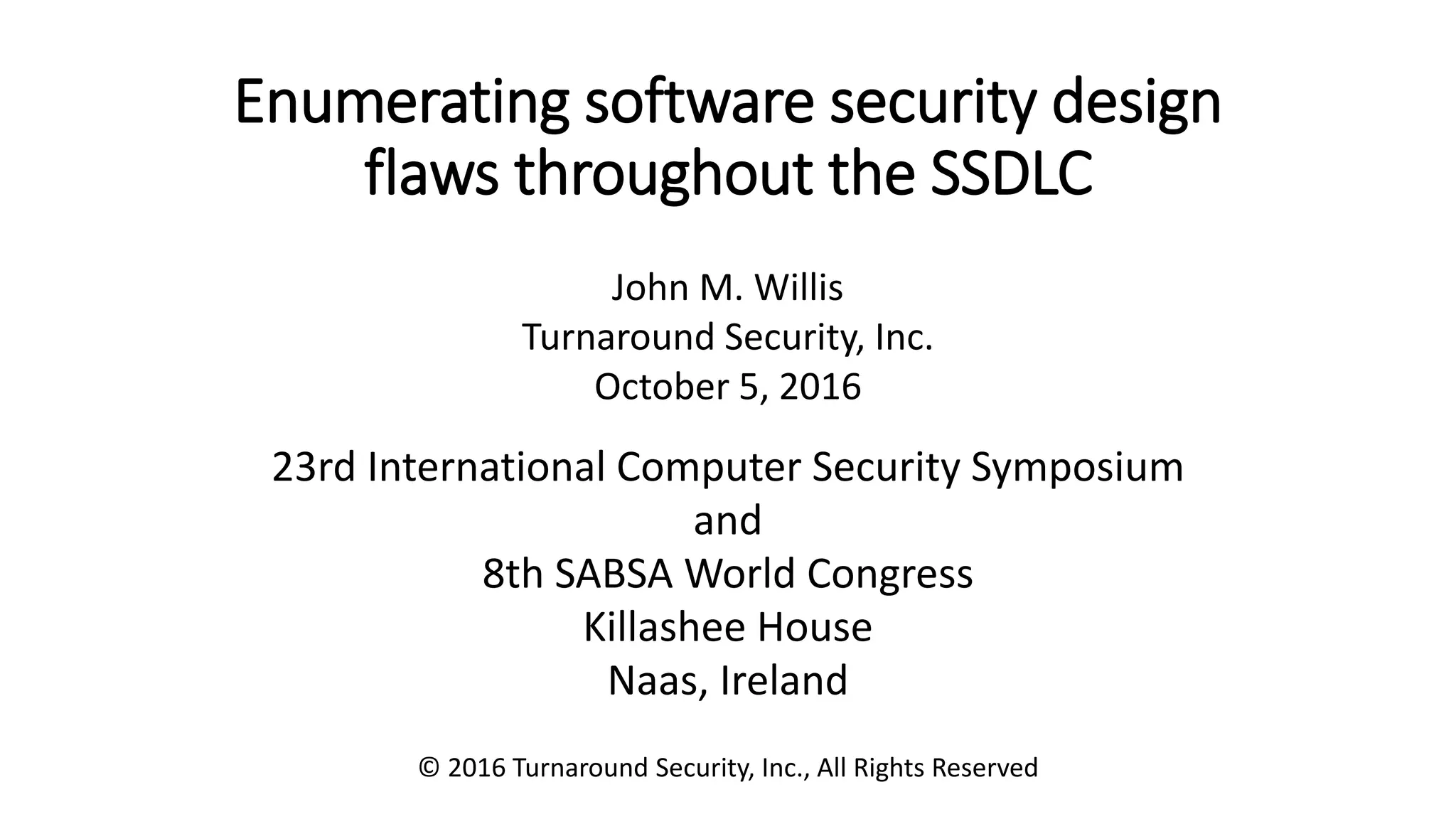 The document discusses a tool aimed at improving software security design by establishing a formal method for capturing detailed architecture and design requirements during the Secure Software Development Life Cycle (SSDL). It highlights the need for a structured approach to identify security requirements and their dependencies, integrating community-developed requirements with threat modeling. The tool is designed for security architects, engineers, and ultimately developers, to address vulnerabilities and ensure comprehensive security feature implementation.