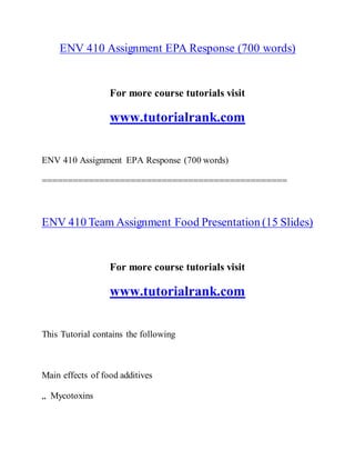 The document outlines a series of assignments for an environmental course focused on toxicology, including topics such as food additives, toxicants, and significant case studies like the Exxon Valdez oil spill and Love Canal. Each assignment requires students to write papers that explore various aspects of toxicants, including their properties, mechanisms of action, and environmental impacts, all formatted according to APA guidelines. Additionally, the assignments emphasize the importance of biomonitoring and risk assessment related to environmental health.