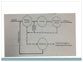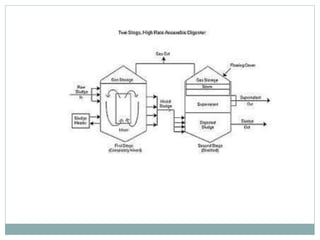 The document discusses sludge treatment and disposal methods in wastewater treatment. It describes how sludge is produced from primary and secondary treatment and its characteristics. Key steps in sludge treatment include thickening to increase solid concentration, digestion to reduce volume and pathogens, and final disposal through incineration, landfilling, or use as fertilizer. Anaerobic digestion is most common and converts sludge into gases and residual biomass through acid-forming and methane-forming bacteria. Aerobic digestion is an alternative but is more energy intensive.