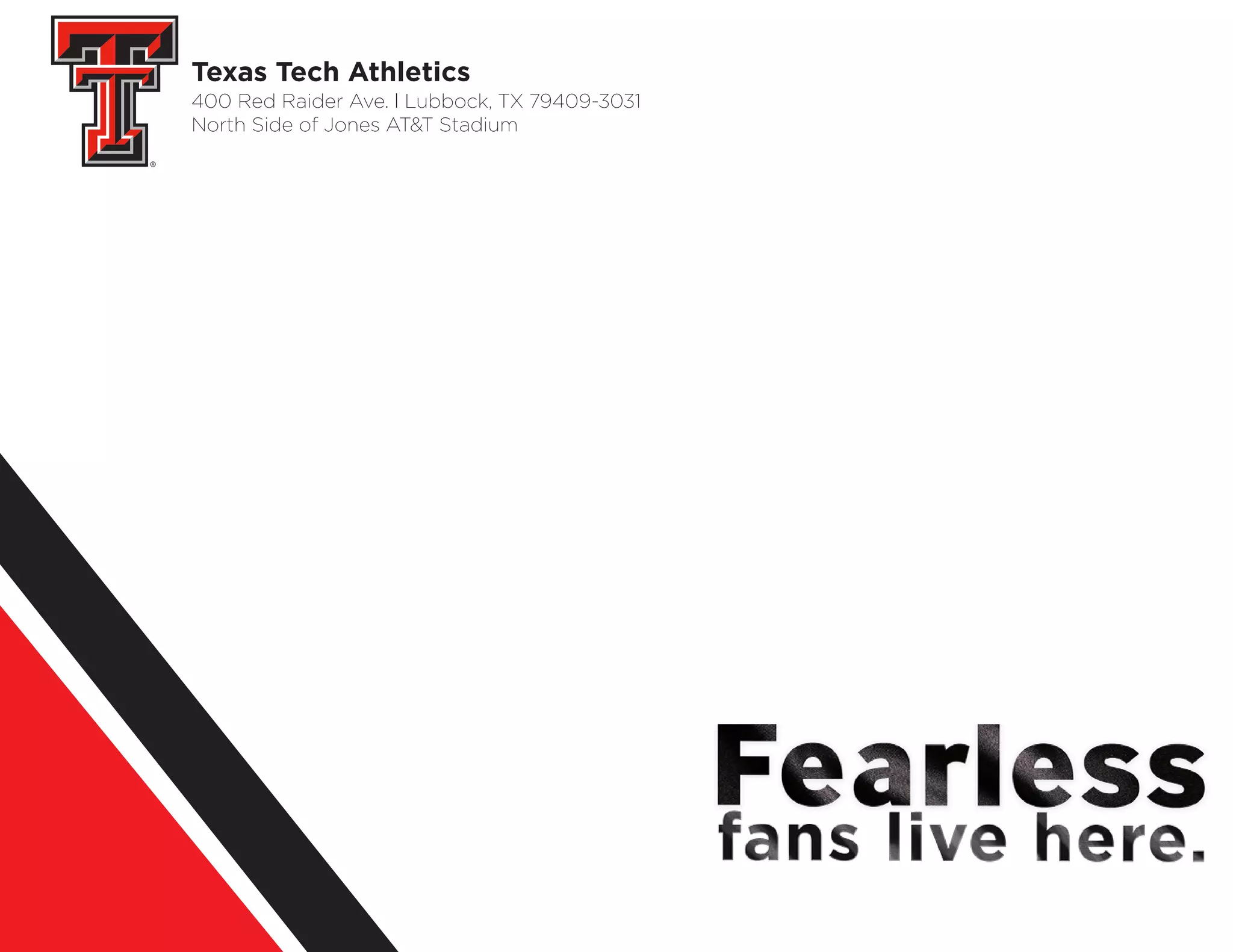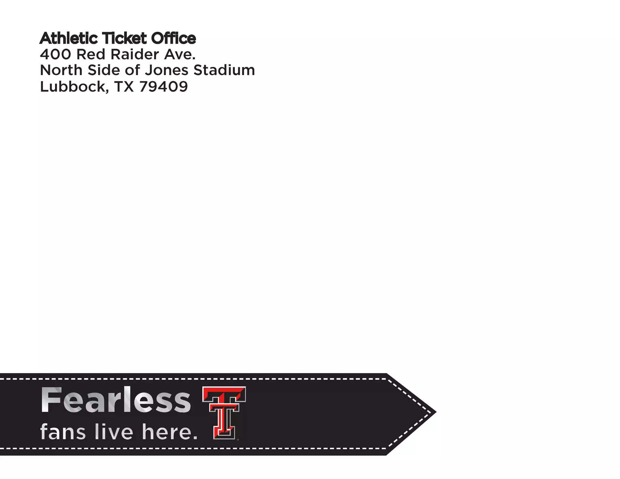 Texas Tech Athletics is located at 400 Red Raider Ave. in Lubbock, TX, on the north side of Jones AT&T Stadium. The Athletic Ticket Office can also be found at this address on the north side of Jones Stadium in Lubbock. Texas Tech Athletics encourages fans to visit Fearlessfanslivehere.texastech.com to learn more.