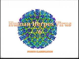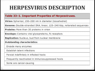 This document discusses several herpesviruses including herpes simplex virus types 1 and 2, varicella zoster virus, and human herpesvirus 6. It provides details on their classification, associated diseases, transmission, pathogenesis, diagnosis and treatment. Herpes simplex virus types 1 and 2 cause oral and genital herpes respectively. Varicella zoster virus causes chickenpox and shingles. Human herpesvirus 6 is associated with roseola infantum and certain neurological conditions. The viruses establish latency after primary infection and can reactivate periodically. Antiviral therapy includes acyclovir for treatment of active infections.