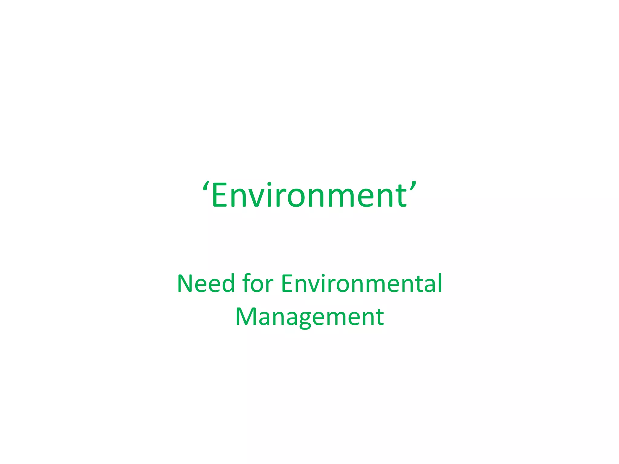 The document discusses the concept of 'spaceship earth' and highlights the importance of environmental management in ensuring sustainable development amid diverse societal classes and ecological challenges. It outlines objectives for environmental management, including prevention of environmental problems, resource conservation, and the integration of multidisciplinary approaches for long-term planning. Additionally, it emphasizes the need for proper assessment and management of natural resources to mitigate pollution and support biodiversity, referencing significant frameworks like the Brundtland Commission and Agenda 21.