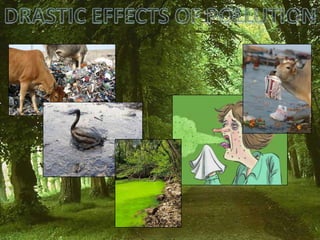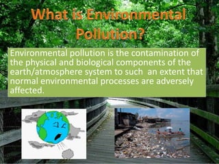 Environmental pollution occurs when contaminants are introduced into the environment at levels that exceed its ability to render them harmless. There are several types of pollution including air, water, soil, and radioactive pollution. Air pollution is caused by emissions from vehicles, factories, and forest fires which introduce harmful chemicals and particulate matter into the atmosphere. This damages human health and the environment. Water pollution occurs when untreated waste is discharged into water bodies, contaminating drinking water and harming aquatic life. Soil pollution is caused by industrial activities and improper waste disposal, introducing toxic chemicals into the ground and reducing soil fertility. If left unaddressed, environmental pollution will continue degrading the earth's ecosystems.