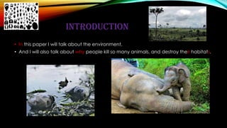 The document discusses how humans negatively impact the environment through killing wild animals and destroying their habitats. It notes that some animals are killed for their skins, teeth, meat, and other body parts to be sold. Specifically, it mentions that tigers, elephants, seals, whales and other species are endangered due to overhunting. The document concludes that if these practices continue, humans are destroying the world by eliminating animal habitats and populations.