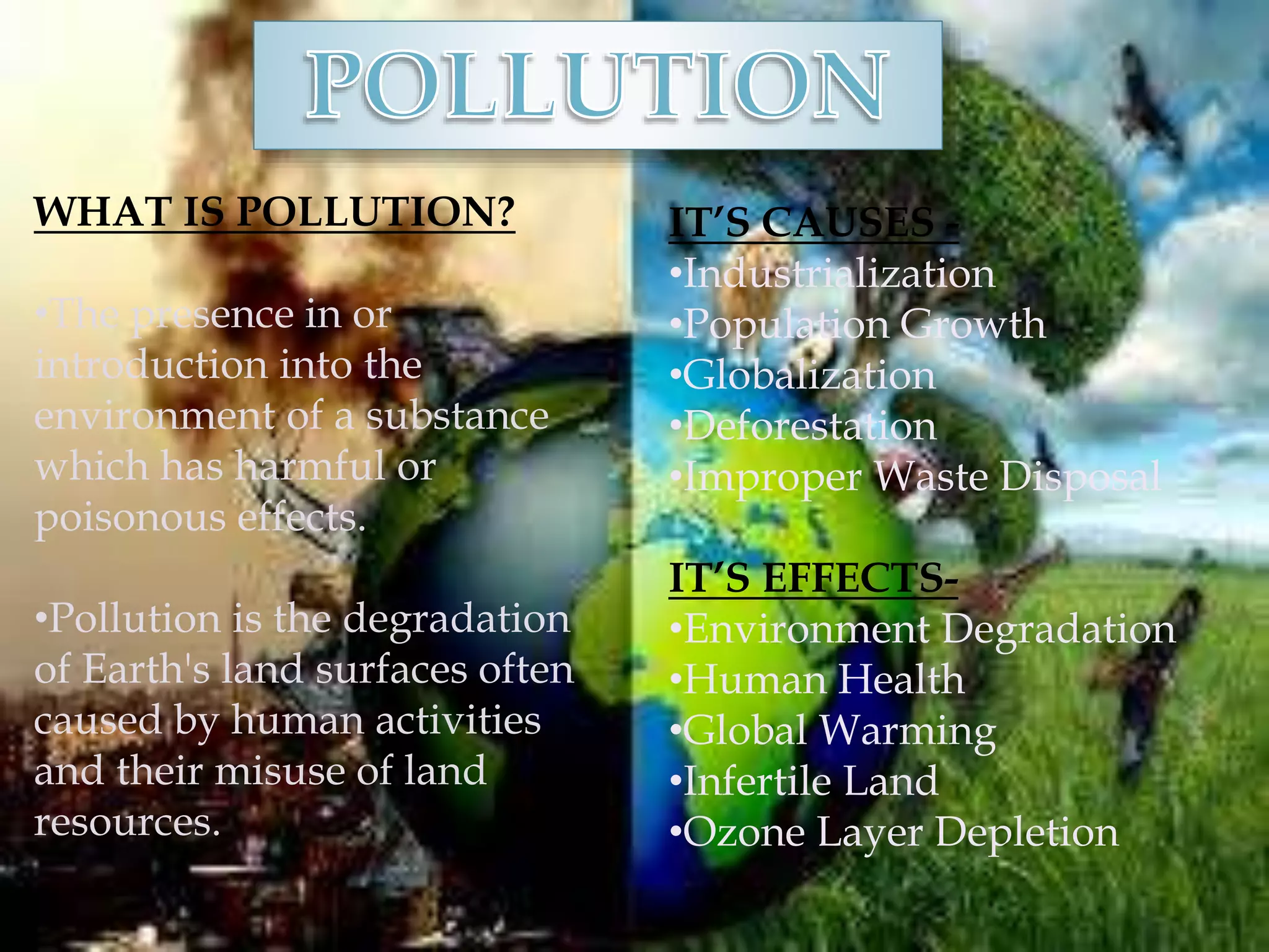 Pollution is the introduction of substances into the environment that have harmful or poisonous effects. It has various causes including industrialization, population growth, and improper waste disposal. The main types of pollution are air, water, soil, noise, radioactive, thermal, light, and marine pollution. Each type degrades the environment and harms human health in different ways such as respiratory illness, global warming, and toxic dust. Efforts are needed to control pollution at its source and educate the public on environmental protection.