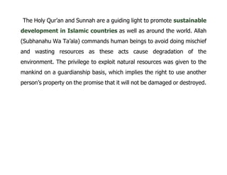 The document discusses the principles of environmental sustainability in Islam, emphasizing the importance of protecting natural resources as a religious duty and social obligation. It highlights the concepts of trusteeship, moderation, and the custodianship role of humans over nature as outlined in the Qur'an and teachings of Prophet Muhammad. Various Islamic teachings advocate against excess and corruption while promoting responsible stewardship of the environment.