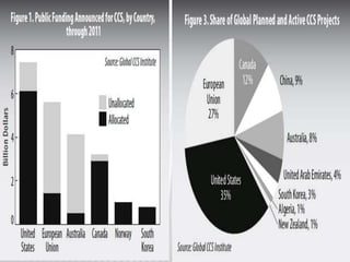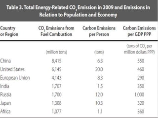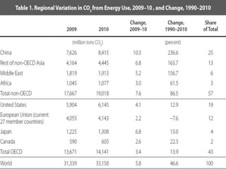 Global carbon dioxide emissions increased significantly in 2010 after declining in 2009, pushing atmospheric CO2 concentrations higher. CO2 levels are now 45% above pre-industrial levels and account for over 70% of global greenhouse gases. The energy sector, particularly coal combustion, represents the largest source of CO2 emissions. While some developed countries have reduced emissions from 1990 levels in accordance with the Kyoto Protocol, other countries like Canada, Australia and the US will not meet their targets. Carbon capture and storage is being developed and tested to reduce emissions from fossil fuel use but currently only operates at a very small scale globally.