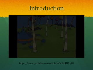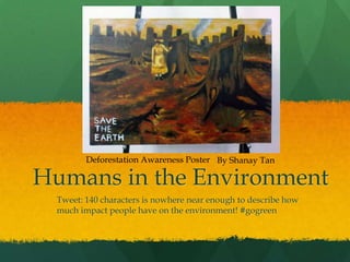This document discusses how human activity impacts the environment. It focuses on how human development and use of resources has changed views of nature from something beautiful to something being destroyed. Research looks at how concepts of beauty and cleanliness relating to the environment have changed over time. Results show acceleration of deforestation and rising carbon dioxide levels due to fossil fuel use. Artwork depicts negative effects of industrial pollution through images like dead animals and chopped down trees. The conclusion is that human progress for personal benefit has altered the view of nature from art to symbols of destruction.
