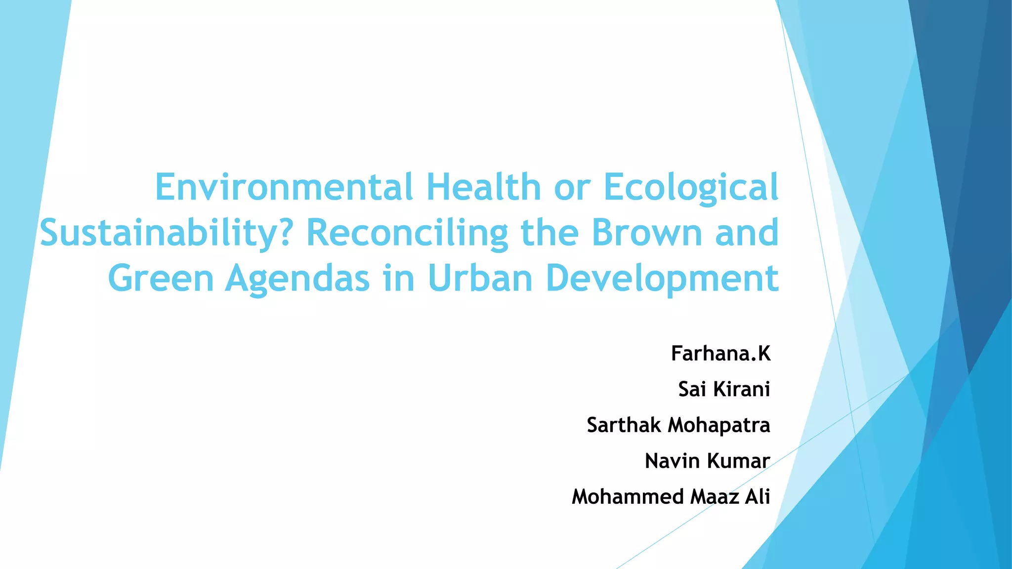 This document discusses reconciling the "brown agenda" of improving urban environmental health with the "green agenda" of ensuring ecological sustainability. It outlines key differences between the agendas in terms of timeframes, scales, and priorities. Both agendas aim to improve equity but focus on different aspects. Issues like water, sanitation, waste, and land use illustrate tensions between prioritizing current health needs versus long-term sustainability. Integrating the agendas requires reducing inequities, enabling collective responses, and understanding local environmental challenges.