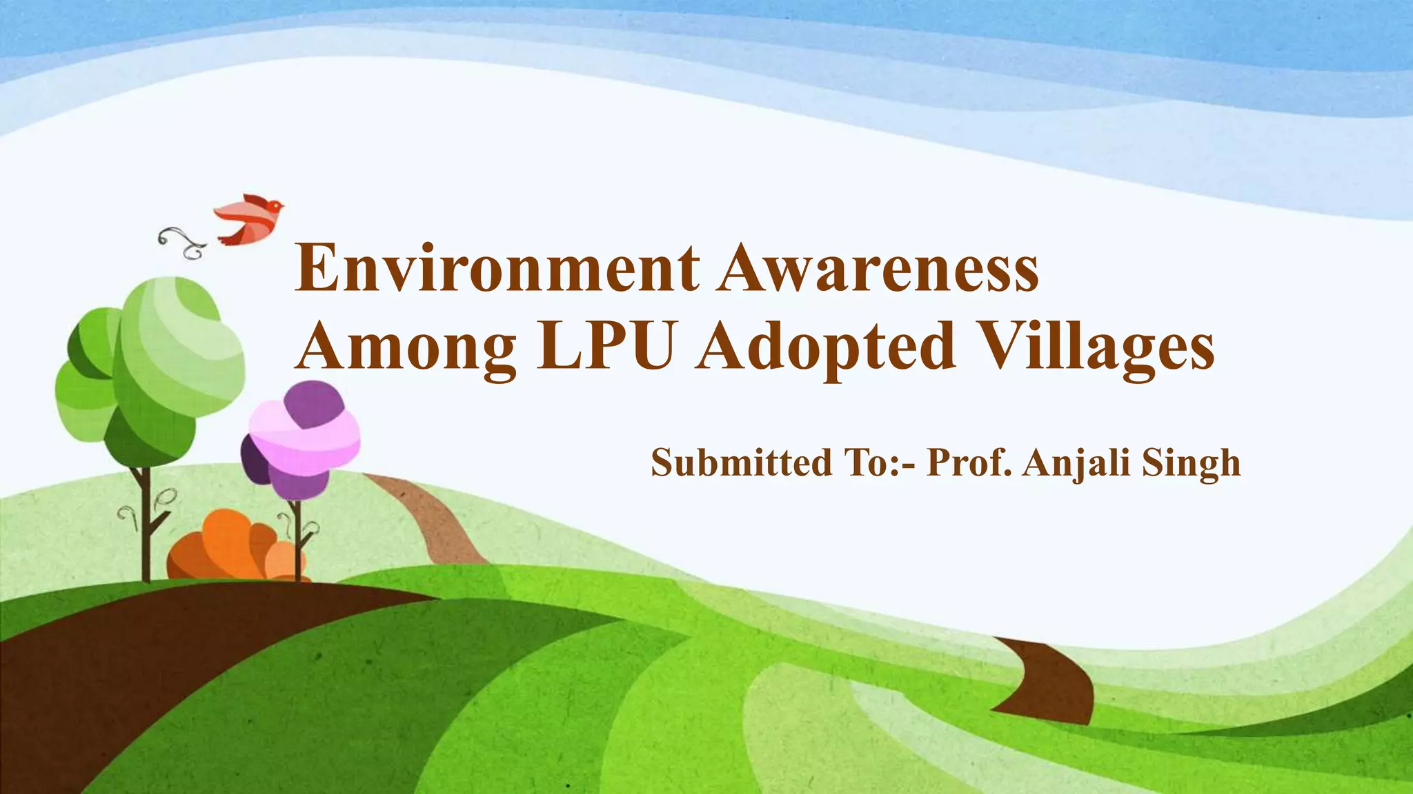 The document details an environmental awareness project by Lovely Professional University that aims to transform 10 nearby villages into 'smart villages' through education on sustainable practices. It highlights public perceptions, efforts made, and problems faced related to environmental conservation, including water scarcity and pollution. The conclusion stresses the importance of awareness programs in reducing environmental impacts and promoting sustainable practices among villagers.
