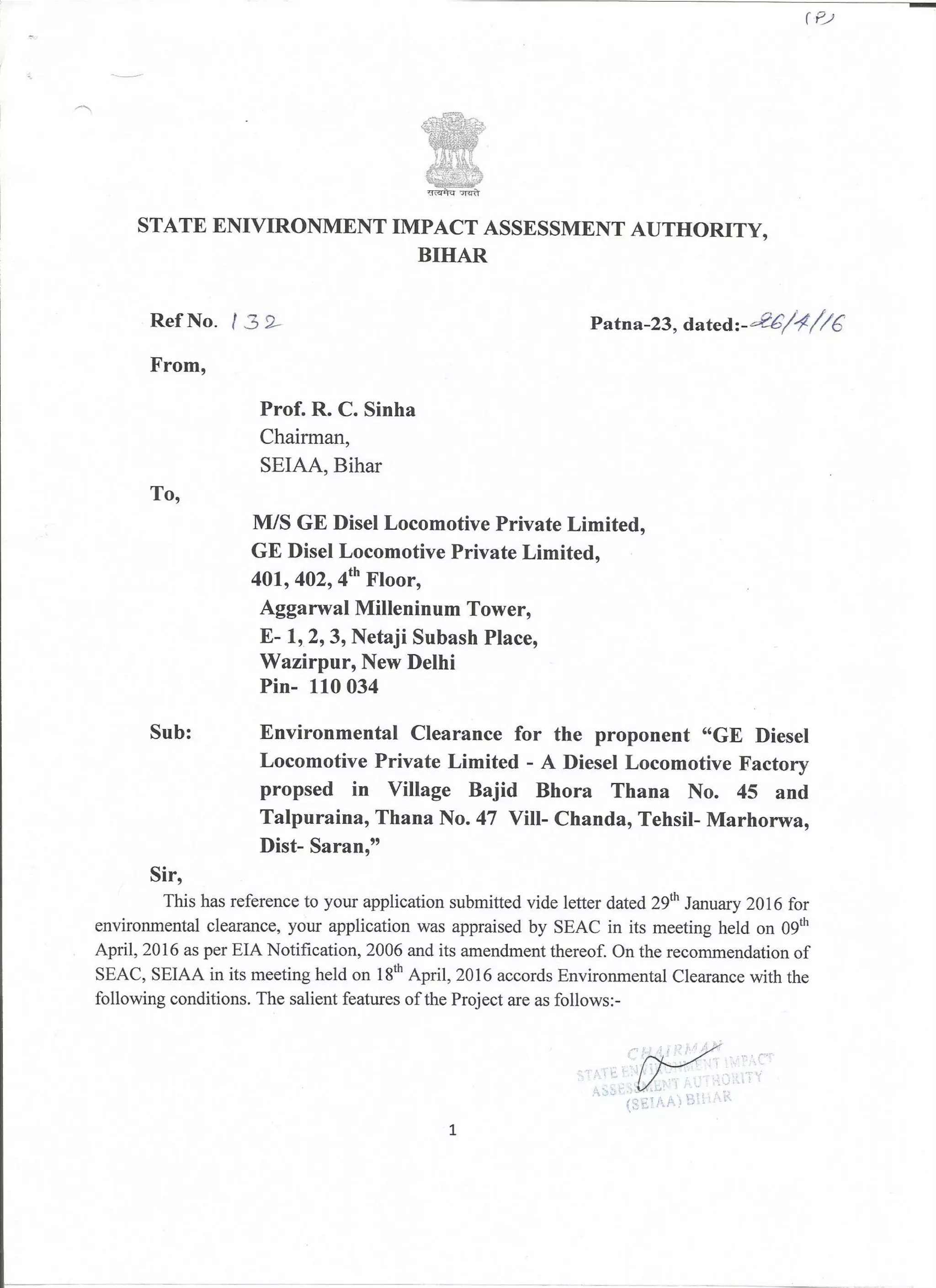 Environment Clearance Letter for GE Diesel Locomotive project