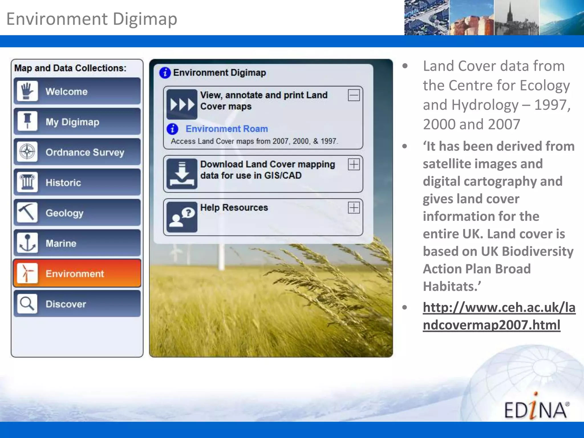 The document provides an overview of the Digimap service, focusing on land cover data from the Centre for Ecology and Hydrology and its various features, including data downloading options, map customization tools, and the upcoming feature identification tool. It discusses different map data types, such as raster and vector data, methods for importing and annotating maps, and resources for training workshops. Additionally, it lists other useful data sources and provides contact information for user support.