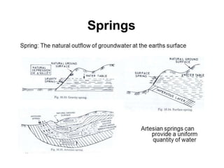 The primary source of water on Earth is precipitation. Most precipitation infiltrates into the ground and joins groundwater sources, or runs off into surface water sources like rivers, lakes, and reservoirs. The main surface water sources are rivers, streams, lakes, ponds, and impounding reservoirs. The main groundwater/subsurface sources are springs, infiltration galleries, infiltration wells, and dug or tube wells. Rivers are the most important sources of water supply since they provide large quantities of water throughout the year. Storage reservoirs created by dams are also important since they can regulate water supplies.