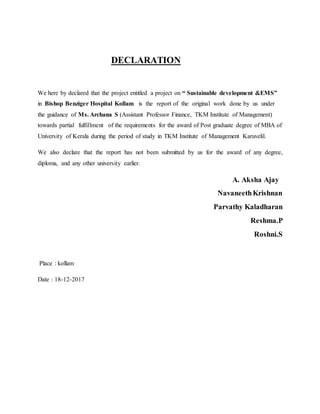 The document discusses the process of waste management at Bishop Benziger Hospital in Kollam, India. It begins by categorizing hospital waste according to the WHO as infectious, sharps, pathological, pharmaceutical, radioactive, and other wastes. It then describes the sewage treatment plant and biogas plant used to treat liquid waste. The sewage treatment plant uses a three-stage process to treat sewage, while the biogas plant converts organic waste into biogas and manure. Proper waste management is important to protect patients, staff, and the environment from harmful pathogens and pollution.