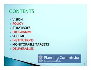 This document outlines India's vision, policies, strategies, and targets for managing the environment, forests, wildlife, and climate change challenges for the 12th Five Year Plan period. It includes goals such as increasing forest cover, improving river and coastal zone management, reducing pollution in urban areas, and strengthening biodiversity conservation efforts. Specific targets are set for restoring degraded lands and wetlands, expanding ecotourism, training more veterinarians, and increasing participation in environmental protection programs. The plan aims to balance ecological sustainability, equity in access to resources, and inclusive growth through institutional reforms and capacity building initiatives.