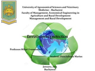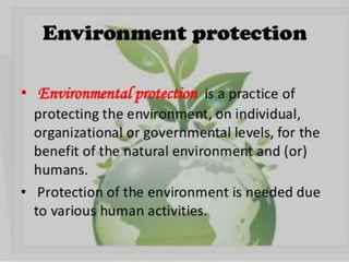 This document discusses various topics related to environment protection. It defines environment protection and discusses key issues like the greenhouse effect, acid rain, wildlife extinction, deforestation, pollution, and ecology. It specifically examines selective collection and recycling, noting that selective collection is one stage of recycling that separates waste to transform it into useful products. Recycling reduces energy consumption and excessive use of natural resources. The document also defines environmental pollution as an undesirable change in the physical, chemical, and biological characteristics of air, land, and water. Pollutants are categorized as either biodegradable or non-biodegradable. Biodegradable pollutants are broken down by microorganisms while non-biodegradable poll