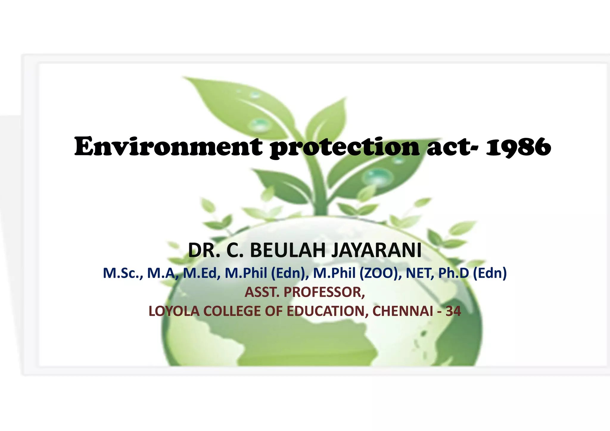 The Environment Protection Act of 1986 was enacted to protect and improve the environment in India, particularly following the Bhopal gas tragedy. It aims to prevent pollution, tackle specific environmental issues, coordinate regulatory activities, and promote sustainable practices like using alternative energy sources and biological pest control. Key measures include establishing environmental laboratories, setting emission standards, and implementing safeguards against accidents.