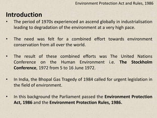 The Environment Protection Act was passed in 1986 to provide a framework for coordinated environmental protection activities across India. It established the Central Government as the primary authority over environmental protection, empowering it to coordinate state governments, establish standards, and regulate pollution control. It also implemented stringent penalties for violations including fines and imprisonment. The Act serves as an umbrella legislation covering various environmental rules and is aimed at protecting and improving the overall environment in India.
