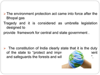 The Environment Protection Act of 1986 was enacted in India to provide a framework for the protection and improvement of the environment, particularly in response to the Bhopal gas tragedy. It includes provisions for the prevention and control of environmental pollution, outlines the powers of the central government, and establishes penalties for violations. The act has faced challenges such as legal disputes over plastic bans and highlights the need for awareness and community participation in environmental issues.