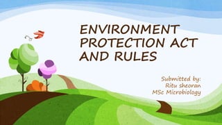 The document summarizes the key aspects of the Environment Protection Act of 1986 in India. It was enacted to protect and improve the environment in the wake of the Bhopal gas tragedy. The Act gives powers to the central government to coordinate environmental protection efforts. It establishes rules and penalties related to pollution. The Act has 4 chapters covering general powers, pollution prevention and control, roles of government analysts, and miscellaneous items. Landmark court cases that have referenced the Act are also summarized.