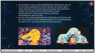 The document discusses the significance of environmental psychology in understanding the interactions between humans and their various environments, including natural, social, and built surroundings. It emphasizes the need for interdisciplinary collaboration to address social and environmental problems, highlighting how attitudes and behaviors towards the environment can influence sustainable development. Additionally, it notes the role of architectural design in enhancing the well-being of occupants by considering physiological, intellectual, emotional, behavioral, and spiritual health aspects.