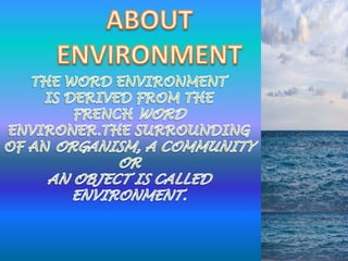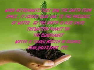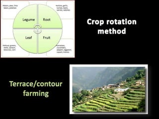 The document discusses various natural resources like water, minerals, food, land, and energy. It provides information on the classification, threats, and conservation methods for each resource. The key natural resources are defined as materials or substances occurring in nature and used by living organisms. The document outlines causes of depletion or pollution for each resource and suggests measures to conserve them, like reducing waste, implementing sustainable farming and mining practices, and increasing renewable energy use.