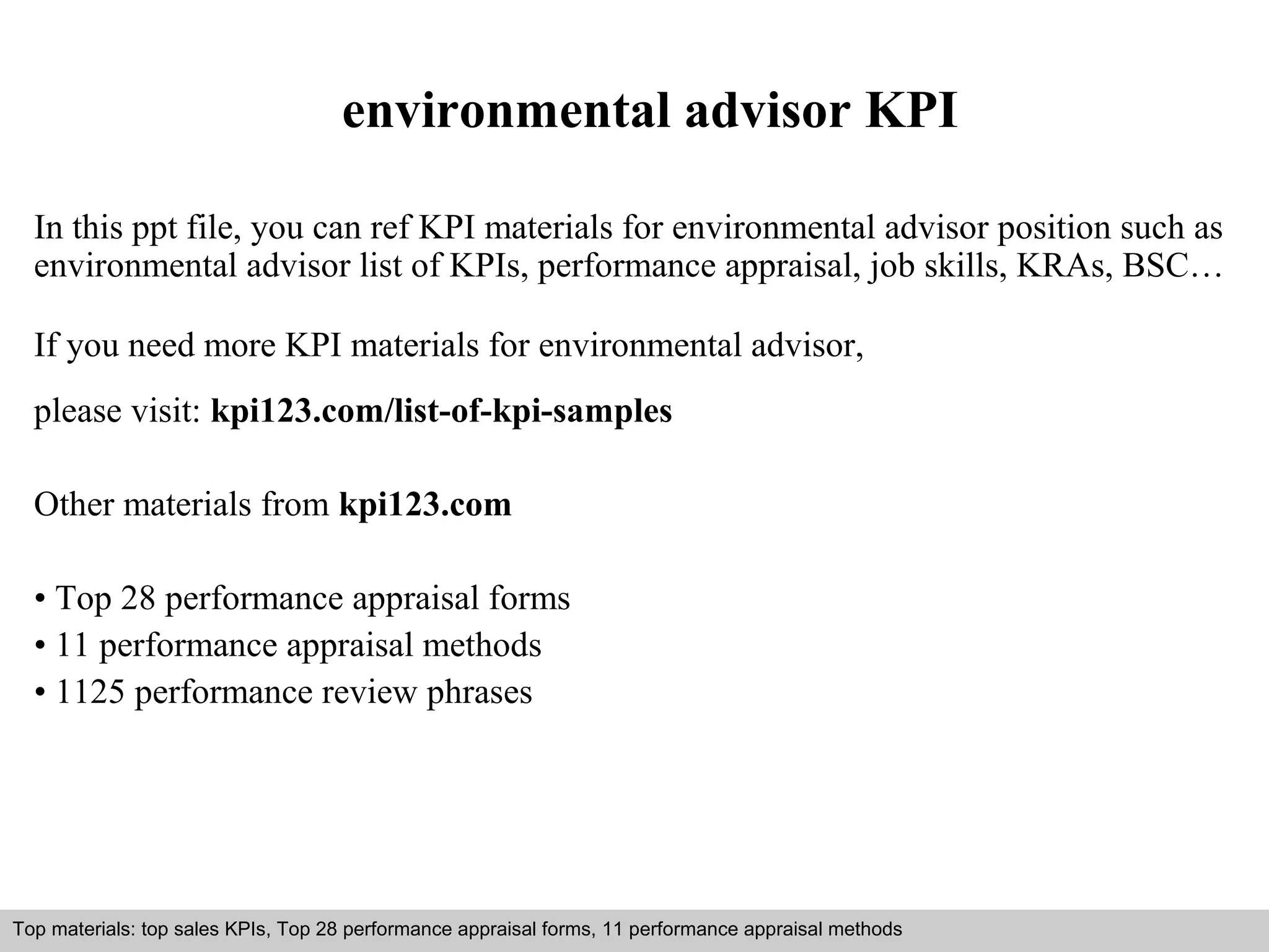 The document discusses key performance indicators (KPIs) for an environmental advisor position. It provides information on developing KPIs, including defining objectives, identifying key result areas and tasks, and determining methods to measure results. The document recommends keeping the number of KPIs limited to 3-5, linked to strategy, and designed to empower employees. It also lists different types of KPIs and provides resources for additional KPI materials.