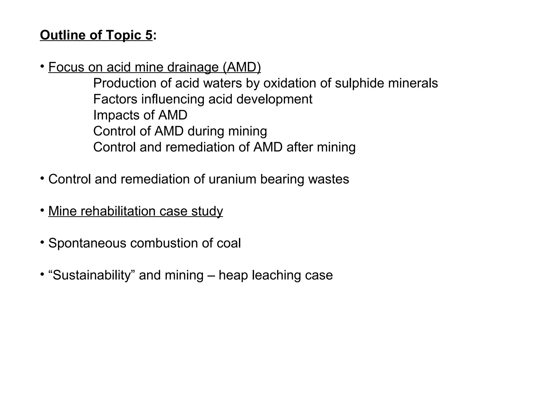 The document provides an overview of environmental and social concerns related to metals, minerals, and mining. It discusses acid mine drainage in 3 paragraphs, summarizing that it is caused by oxidation of sulphide minerals when in contact with water and oxygen, produces acids and dissolved metals, and has wide-ranging negative environmental impacts. It also briefly summarizes control and remediation of uranium waste and a mine rehabilitation case study of the Sherwood Uranium Mine.