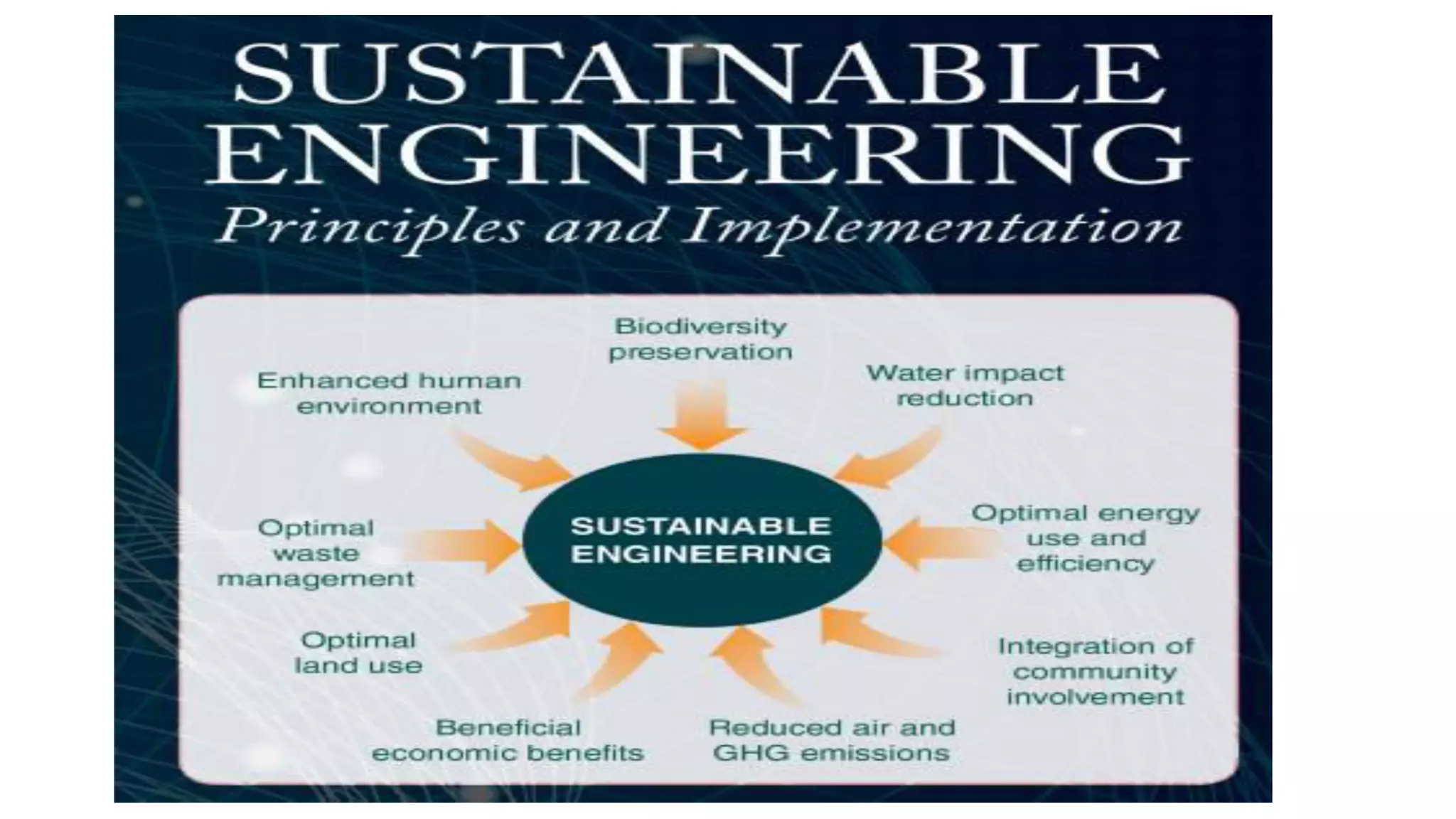 This document discusses sustainable engineering and the environment. It begins by defining sustainability and outlining the UN's 17 sustainable development goals. Some of the major challenges for engineers in achieving sustainability are depletion of resources, waste management, land degradation, and climate change. Environmental impacts from human activities can include various forms of pollution, loss of habitat, and increased greenhouse gases. The document then discusses practices to achieve sustainability, such as renewable energy and green technologies. Industries can impact the environment through resource extraction, land and water use, and waste generation. Air and water pollution are also discussed. The overall document provides an overview of concepts in sustainable engineering and environmental challenges.