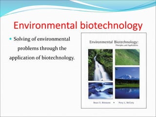 This document discusses environmental biotechnology and environmental microbiology. Environmental biotechnology uses biotechnology to solve environmental problems, while environmental microbiology studies microbial interactions and communities in the environment. The document then provides examples of areas within environmental biotechnology and microbiology, including molecular ecology, bioremediation, biosensors, and biofuels. Molecular ecology uses genetic tools to study ecology and biodiversity. Bioremediation uses bacteria or fungi to break down hazardous waste. Biosensors use biological entities like bacteria to monitor chemical or biological levels. Biofuels are plant-derived fuels seen as more environmentally friendly alternatives to traditional fuels.