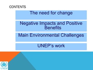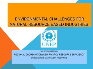 This document discusses environmental challenges for natural resource-based industries. It notes that 20% of the world's population consumes 80% of resources, and if consumption levels don't change, four planets' worth of resources will be needed by 2050. Industries have major responsibilities to assess and address their environmental impacts through principles like precaution, responsibility, and green technology. UNEP works with industries through initiatives like the UN Global Compact to increase resource efficiency, investments in clean production, and consumer choice of sustainable products.