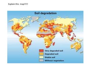 Environmental issues arise from agriculture, ranching, forestry, and fishing activities if not properly managed. Negative effects include deforestation from plowing new lands and overgrazing, soil depletion from overexploitation, pollution from improper pesticide use, overdrawing of aquifers, degradation of forests from overharvesting, and depletion of fishing grounds from excessive catches. Potential solutions involve using sustainable practices like organic farming, reforestation, regulated harvesting, and aquaculture to protect natural resources for future generations.