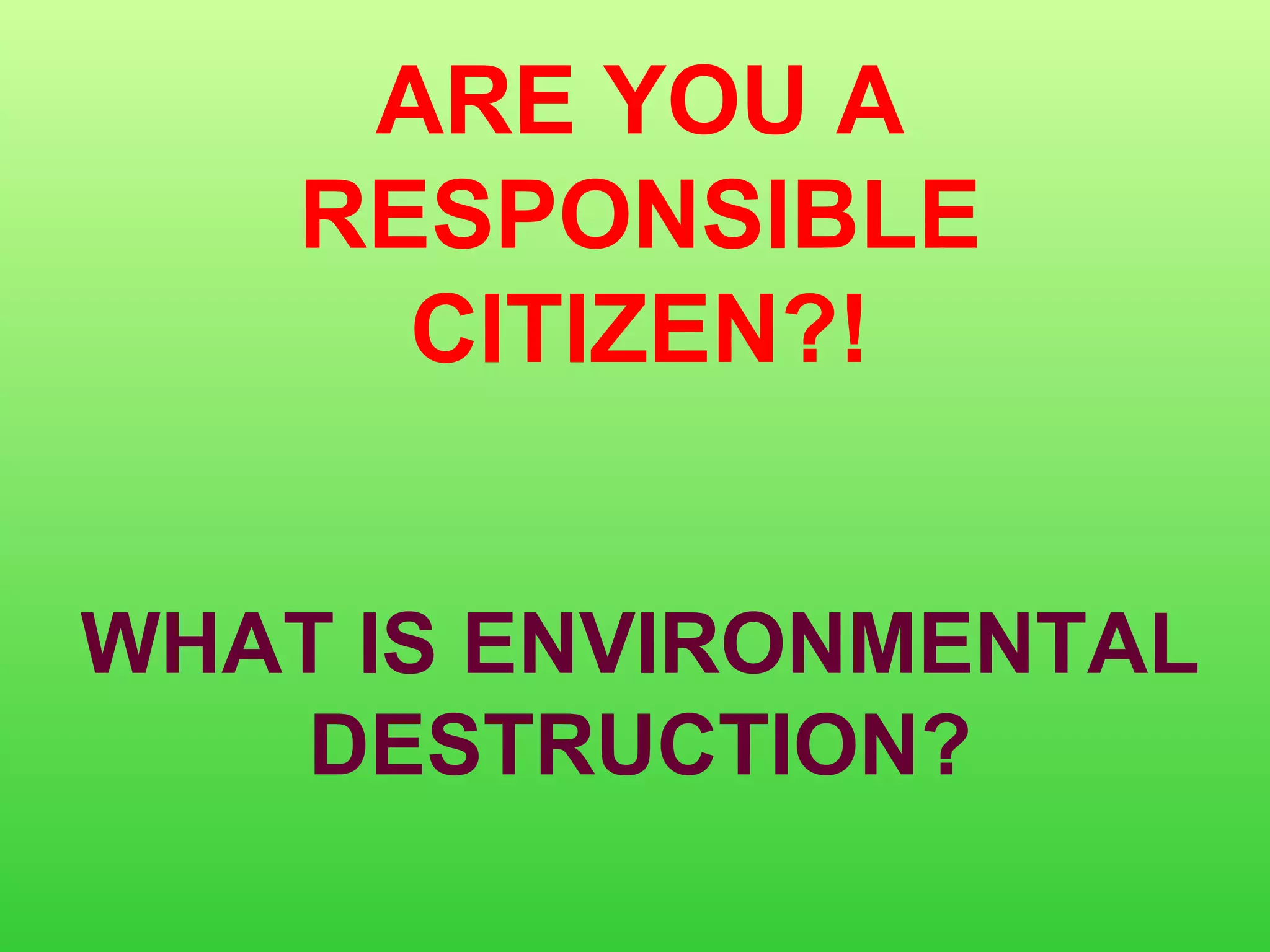 The document discusses environmental destruction and pollution caused by human activities. It defines environment and destruction, and lists some types of environmental destruction like pollution, loss of habitats, and erosion. It encourages students to do a project on environmental destruction by raising awareness about the impact of human activities through various campaign materials like posters, brochures, videos or websites.