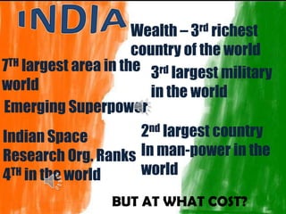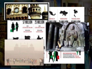 The document discusses the significant environmental challenges facing India, including air and water pollution, land degradation, and biodiversity loss. It highlights the economic importance of the tourism industry and provides statistics on foreign tourist visits while emphasizing the need for better pollution control and sustainable practices. Additionally, it outlines government initiatives and solutions for mitigating environmental degradation, such as waste management and monitoring emissions from industries.