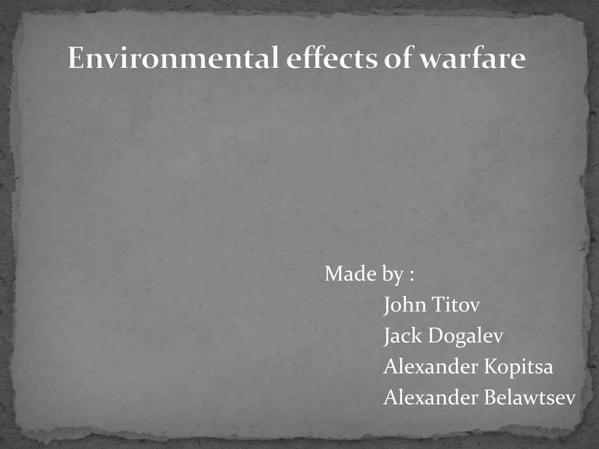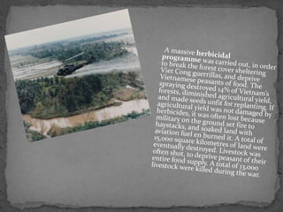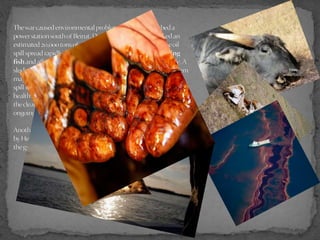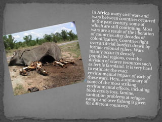 The document discusses the environmental impacts of several wars and conflicts from the 20th and 21st centuries. It describes how the Rwandan civil war in 1994 led to over 2 million refugees, putting pressure on the country's limited resources and destroying gorilla habitats. It also discusses how the Somali civil war encouraged overfishing that was unsustainable and harmed local ecology. The Vietnam War involved extensive bombing and use of toxic Agent Orange that polluted soil, water and vegetation, resulting in health issues for humans and wildlife.