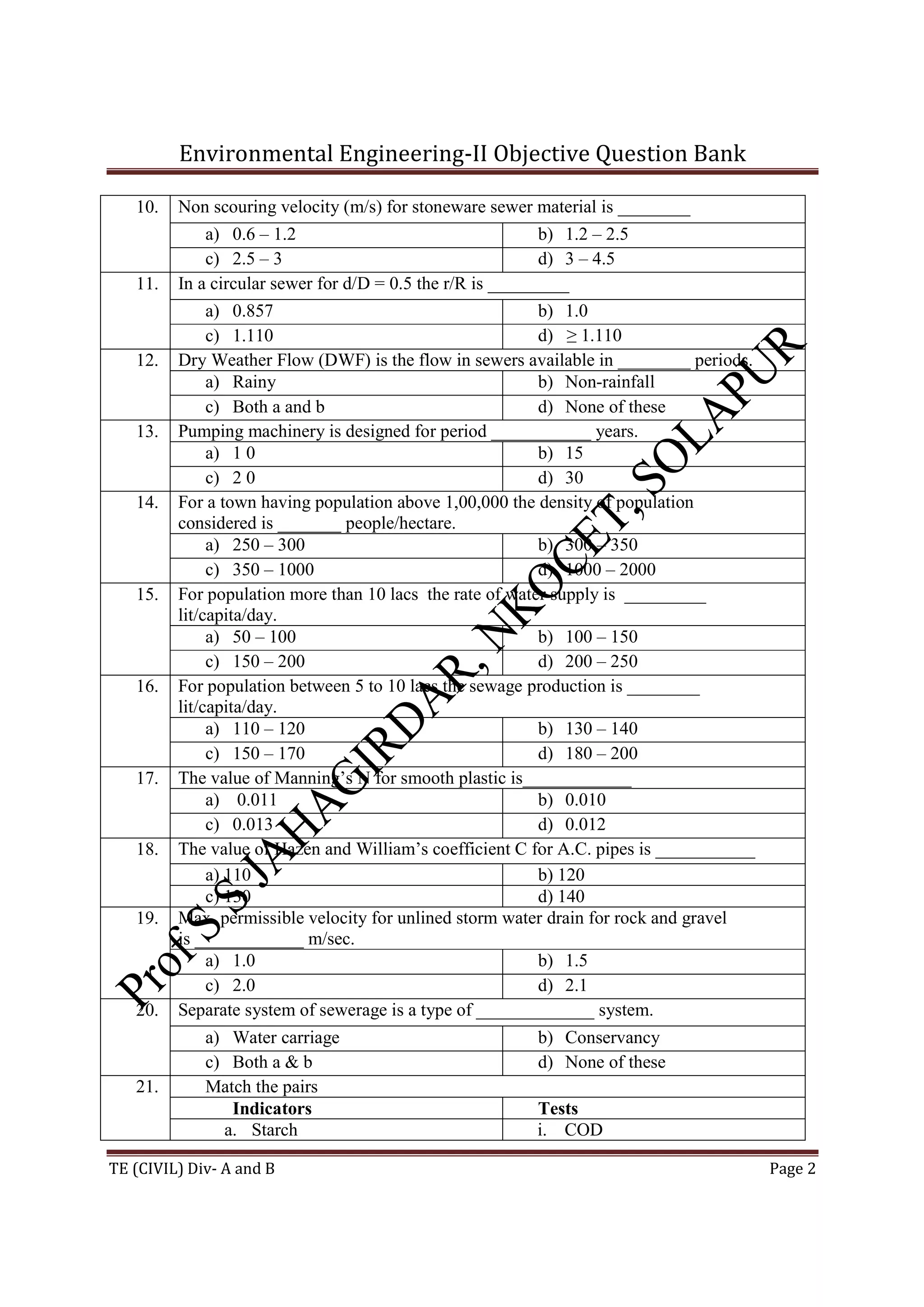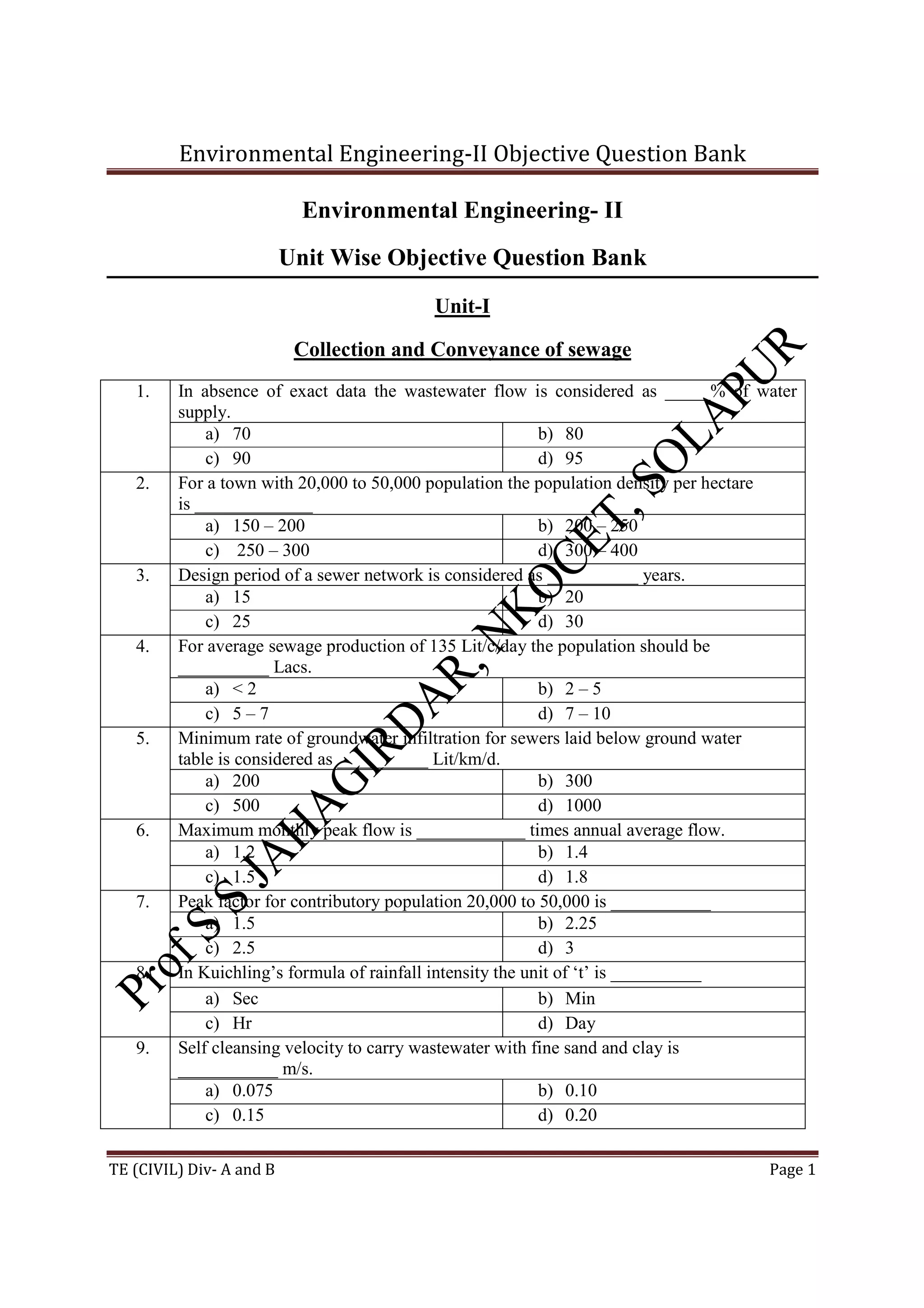 The document is an objective question bank for Environmental Engineering II, covering various aspects of sewage collection, design parameters, and treatment methods. It contains multiple-choice questions related to wastewater management, flow rates, and engineering principles. Each question provides options regarding standard values and engineering practices pertinent to civil engineering and environmental studies.