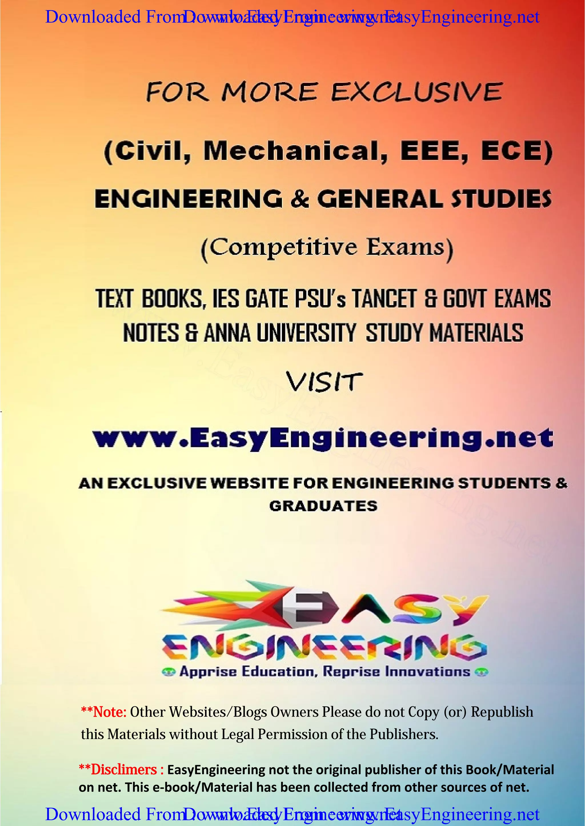 The document contains disclaimers regarding the publishing rights of an e-book or material sourced from various websites, specifically noting that EasyEngineering is not the original publisher. It repeatedly emphasizes the importance of obtaining legal permission before copying or republishing the material. The overwhelming focus of the content is on the origin of the downloaded material and the warnings against unauthorized use.