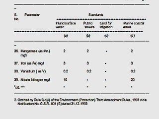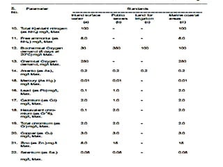 This document provides an overview of environmental engineering and water quality topics. It discusses various water sources including surface sources like rivers, lakes, and streams, and subsurface sources like wells and aquifers. Water quality parameters that are tested are described, including physical parameters like turbidity, color and odor, and chemical parameters like pH, hardness, dissolved solids, and nitrogen content. Microbiological quality indicators like E. coli are also mentioned. Standards for drinking water quality are outlined.